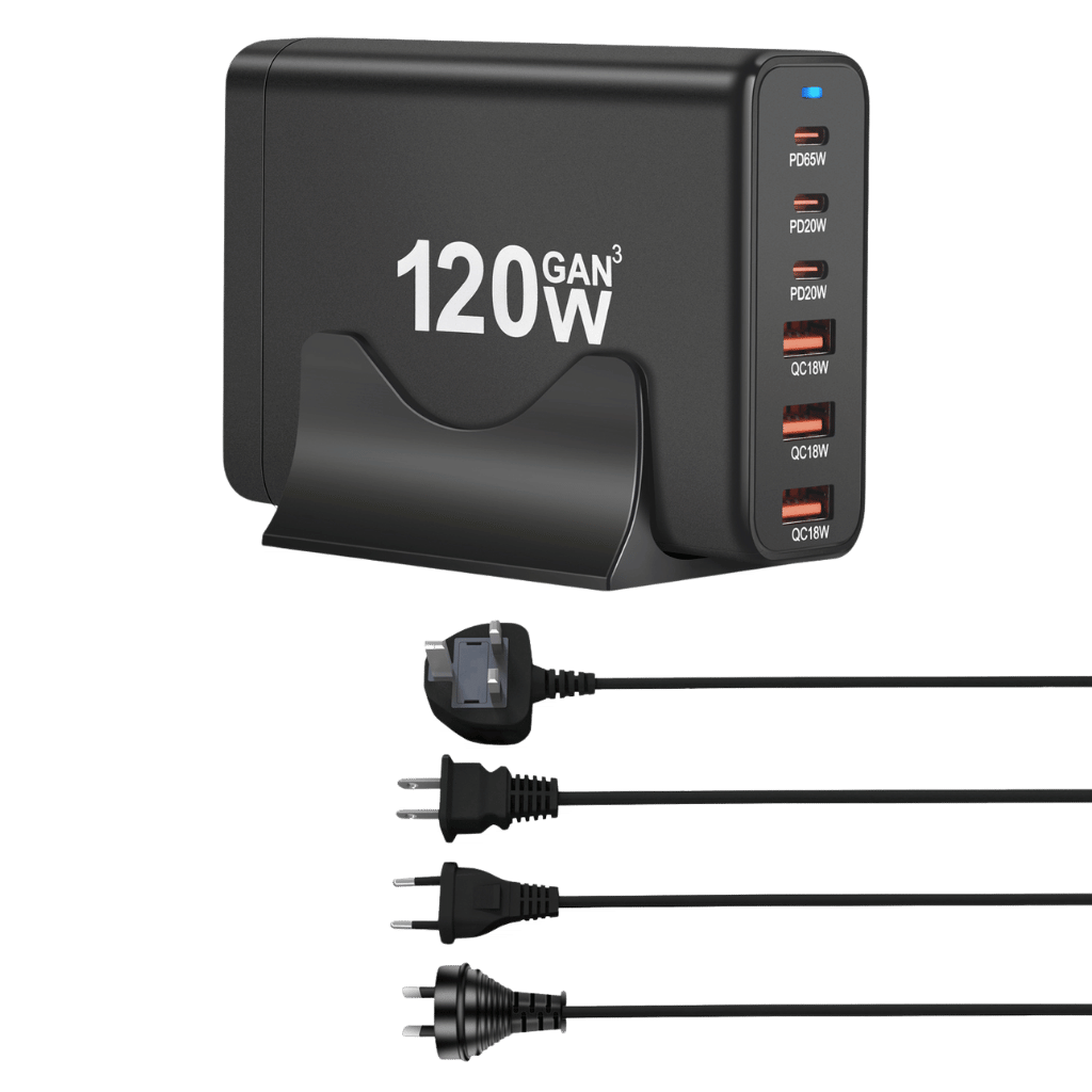 - 120W GaN 6-Port USB-C Charger: Main charging unit equipped with three USB-C and three USB-A ports.