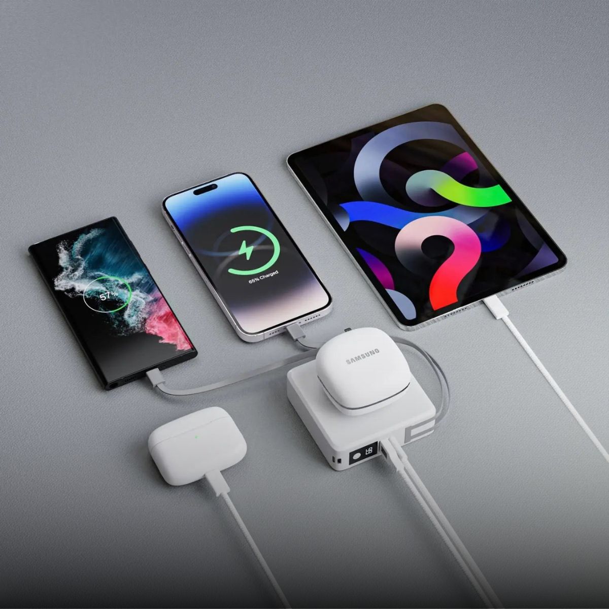 Use all ports + built-in cable to power laptops, phones, earbuds, or tablets at once — intelligently splits output up to 90W.