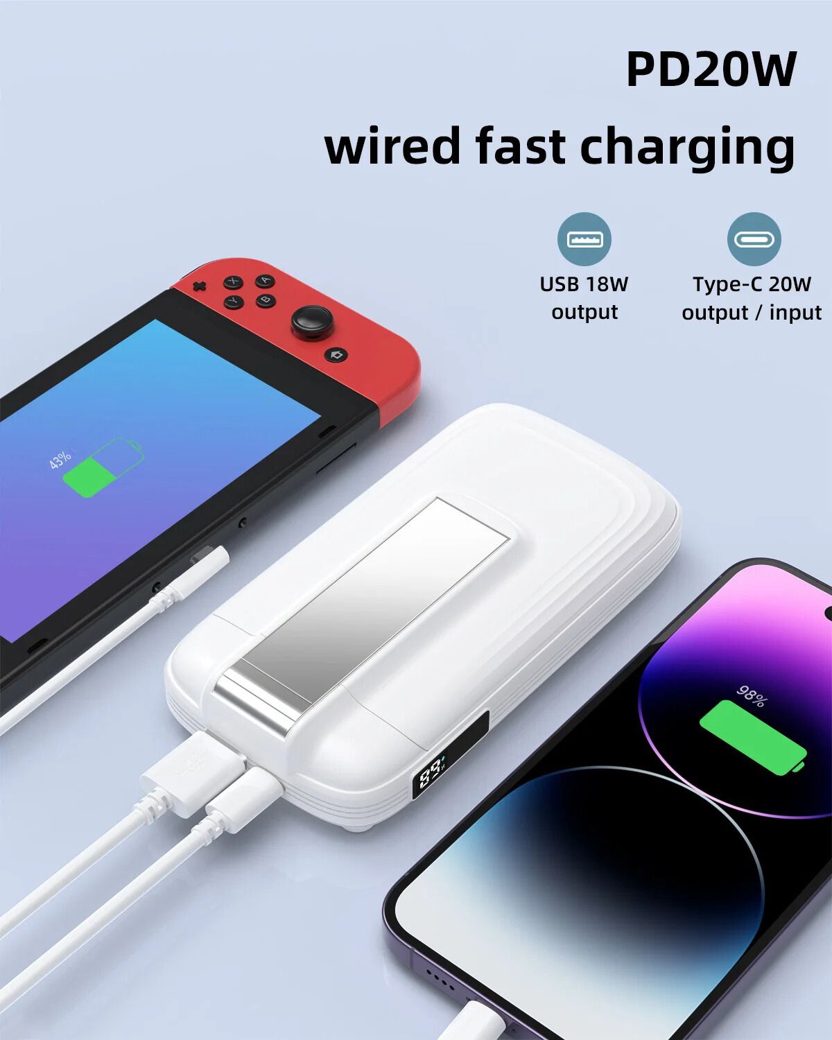 Take advantage of the PD20W Type-C port and USB 18W port for fast, reliable wired charging. Whether you're powering up your smartphone, tablet, or other devices, these ports deliver efficient and speedy charging to keep you connected and ready to go.